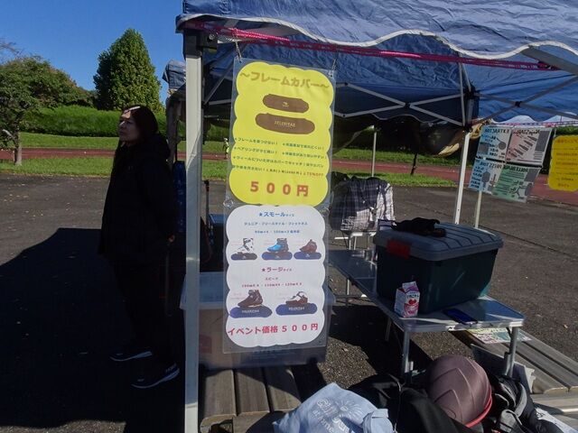 私も時間を見つけてブースにお邪魔したところ、フレームカバーが気になりました。長さもロングとショートがあり、素材も非常に薄く伸び縮もいいので気に入ったのと1足¥500と格安だったので、ロング2足とショート1足を買い求めました。